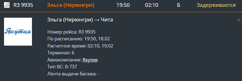 Рейс авиакомпании «Якутия» из Нерюнгри в Читу, запланированный на прибытие 18 февраля в 19:50, задержан более чем на шесть часов. Согласно данным онлайн-табло читинского аэропорта, самолет прибудет только в 02:10.